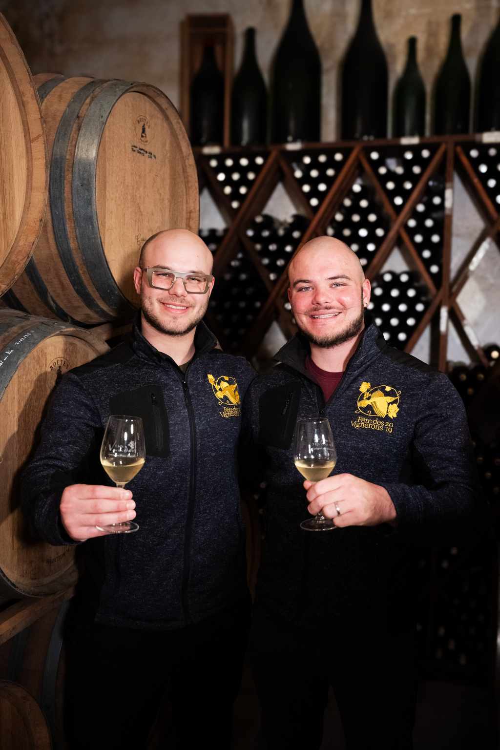 Guillaume (à gauche) est titulaire du CFC viticulteur et est diplômé HES à la Haute école de Changins. Benjamin (à droite) est titulaire du CFC caviste et viticulteur.